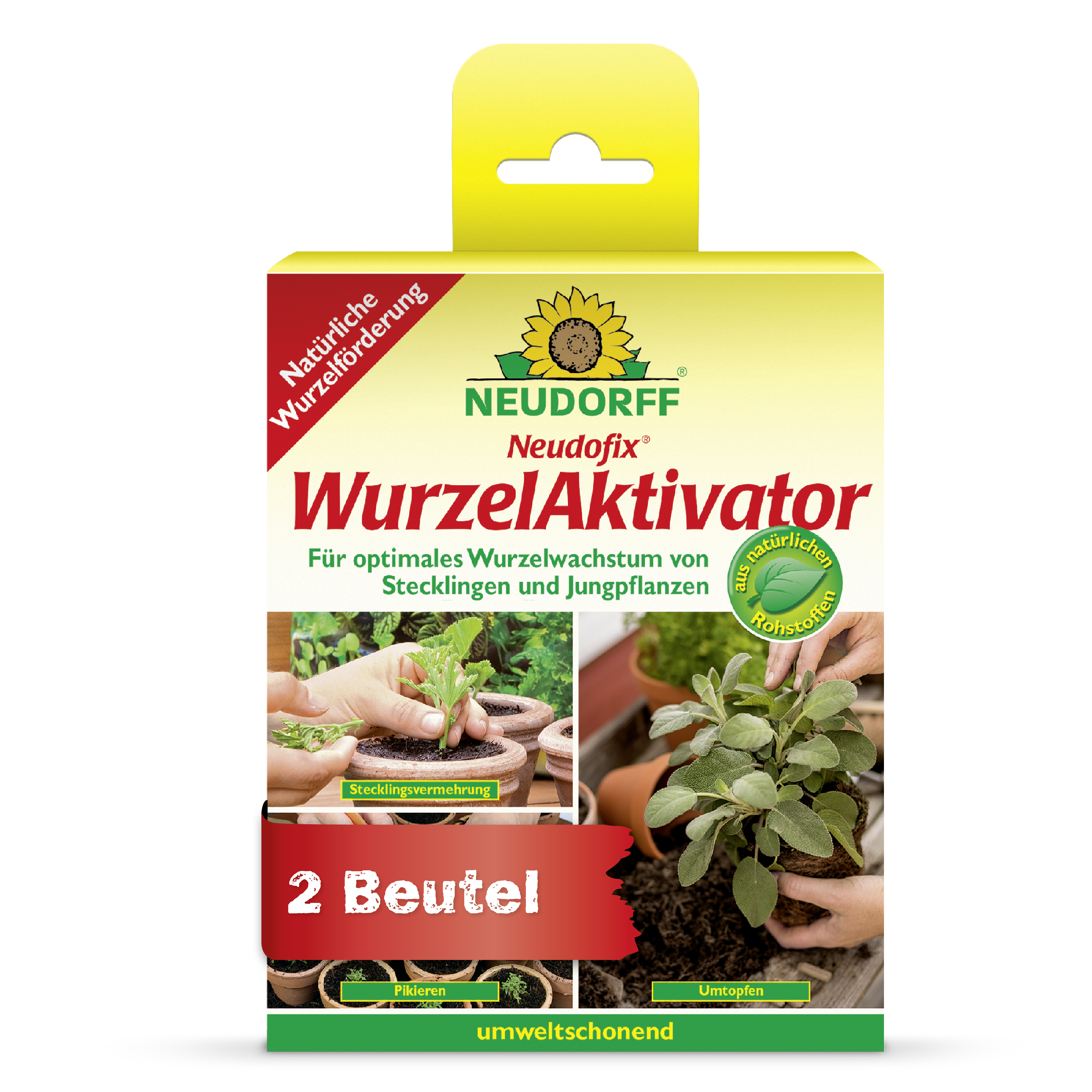 Entweder: Neudofix WurzelAktivator in Wasser lösen (gut rühren) und Pflanzen gießen. Ein 20 g Beutel reicht für 5 Liter Wasser.
