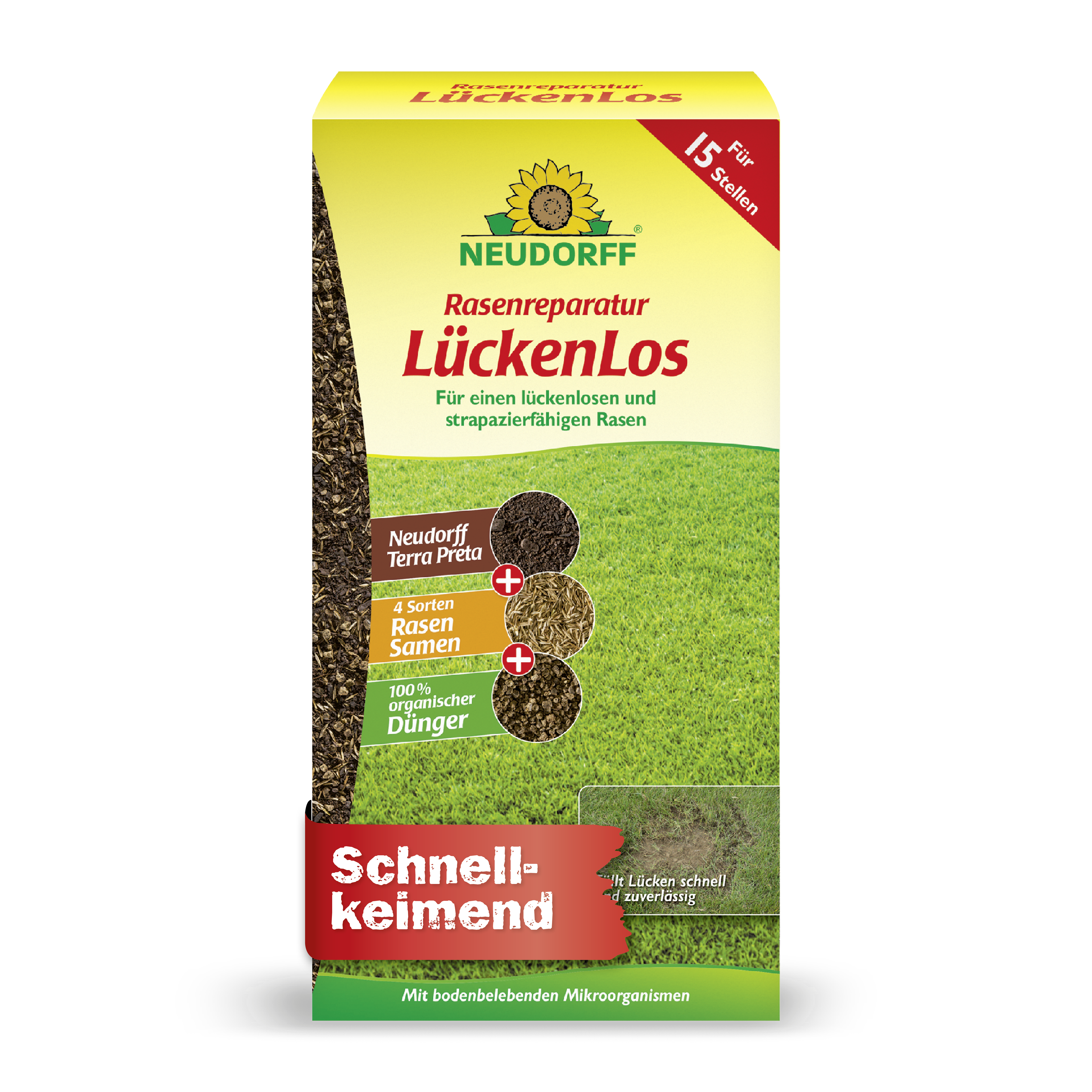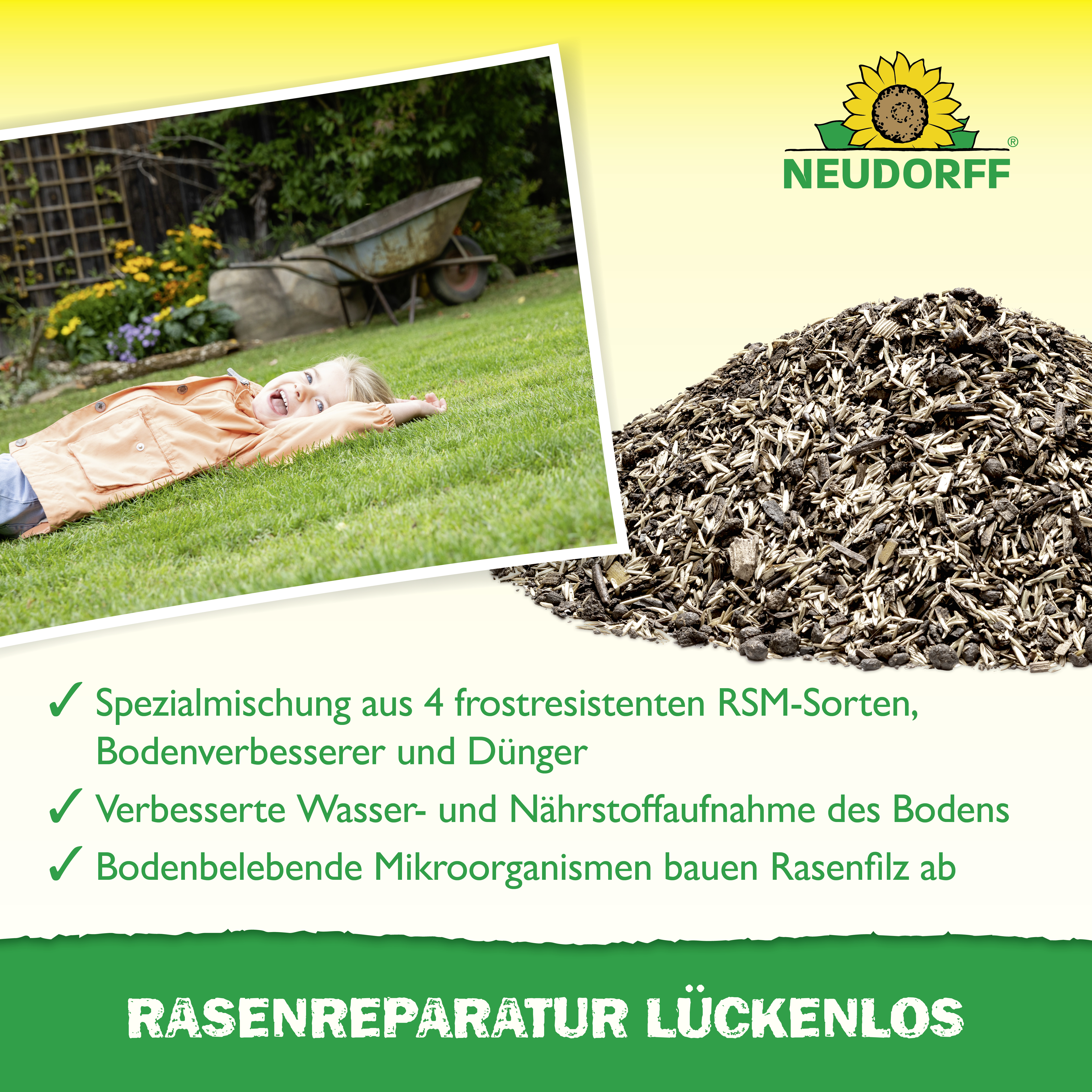 - anwendungsfertige Spezialmischung mit Rasensamen, Neudorff Terra Preta und 100% organischem Dünger