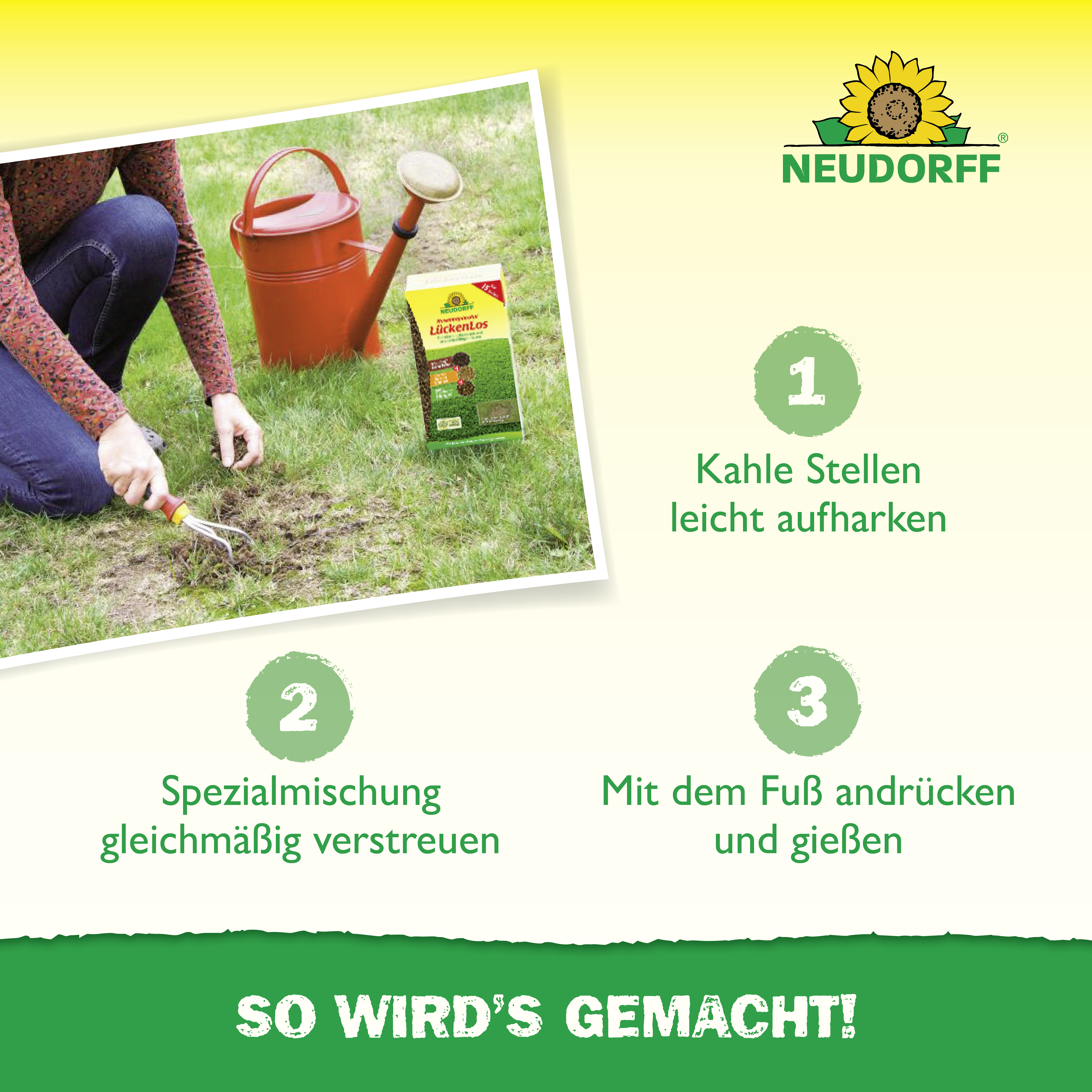 - Speziell zum Ausbessern kleinerer kahler Stellen im Rasen geeignet