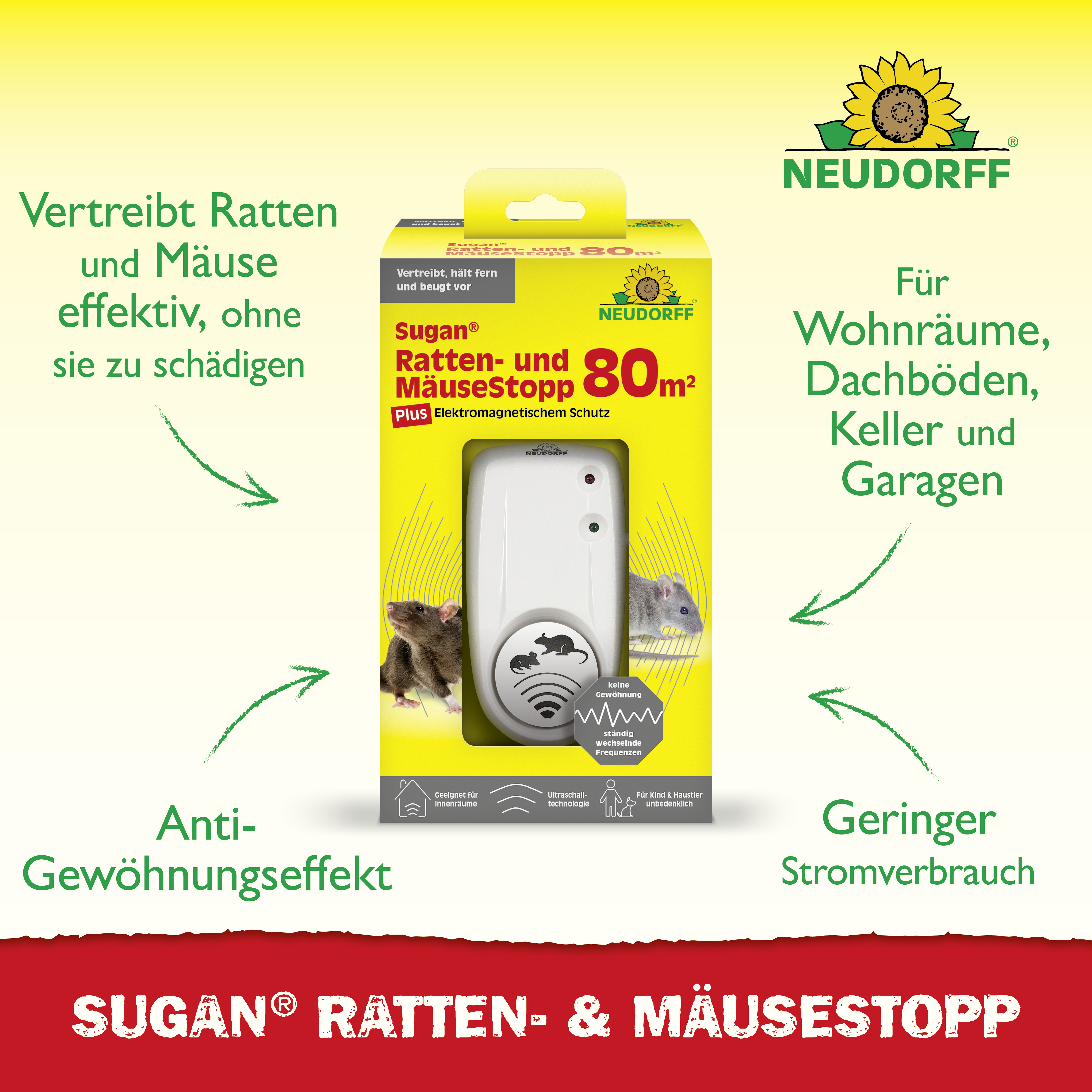 • Durch den kontinuierlichen Wechsel der spezifischen Ultraschallwellen können sich Ratten und Mäuse nicht an die Störung gewöhnen.